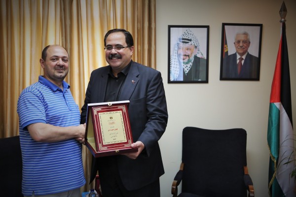 كرَّم وزير التربية والتعليم العالي د. صبري صيدم، في مكتبه اليوم، الفنان المقدسي أحمد داري الذي جاء مهنئاً الأسرة التربوية بإنجاز الإنجاز.