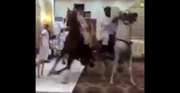 كاد أن يتسبب استعراض بالخيول داخل قاع حفل زفاف بالمملكة العربية السعودية، إلى فوضي.