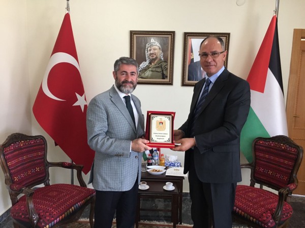 إستقبل د. فائد مصطفى سفير دولة فلسطين لدى الجمهورية التركية، في مكتبه في مقر السفارة في أنقره عضو مجلس الامة الكبير (البرلمان التركي) عن حزب العدالة والتنمية السيد نور الدين نباتي، حيث تركز الحديث على التطورات الاخيرة في القدس والمسجد الاقصى المبارك والواجبات الملقاة على الامة الإسلامية في التصدي لهذه الهجمة الاسرائيلية الجديدة على المسجد الأقصى.