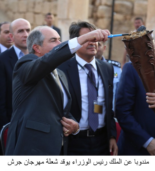 فايز عضيبات - مندوبا عن جلالة الملك عبدالله الثاني، أوقد رئيس الوزراء الدكتورهاني الملقي في الساحة الرئيسية لمدينة جرش الأثرية مساء اليوم الخميس، شعلة مهرجان جرش للثقافة والفنون ايذانا بانطلاق فعاليات دورته الـ 32 .