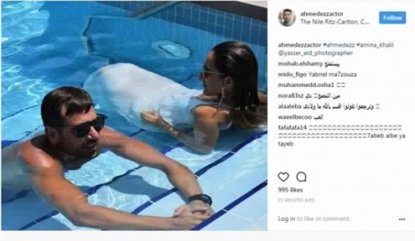 فاجأ النجم أحمد عز متابعيه عبر إنستغرام بنشر صورة في حمام السباحة تجمعه بالفنانة المصرية الشابة أمينة خليل.