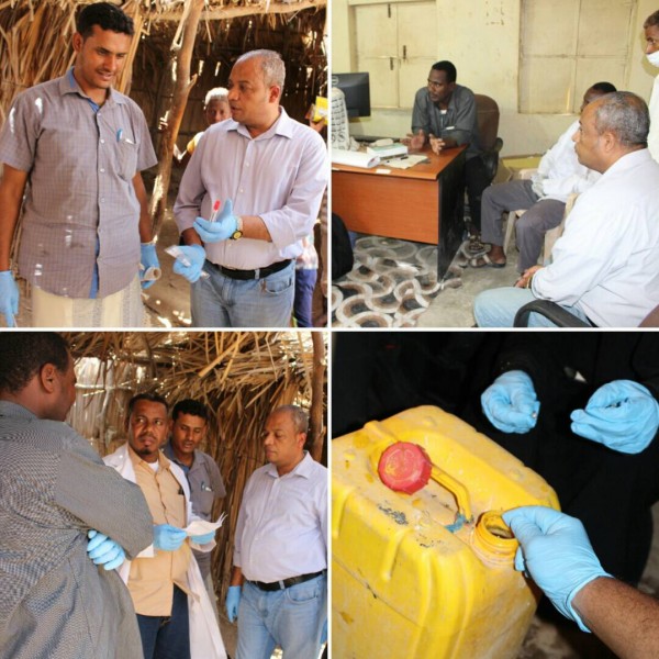 وقد تم خلال النزول أخذ العينات من الحالات المشتبهة في المنطقة والتقصي عن الأسباب التي أدت إلى ظهور تلك حالات مع تزويد مياه الشرب بالكلور.