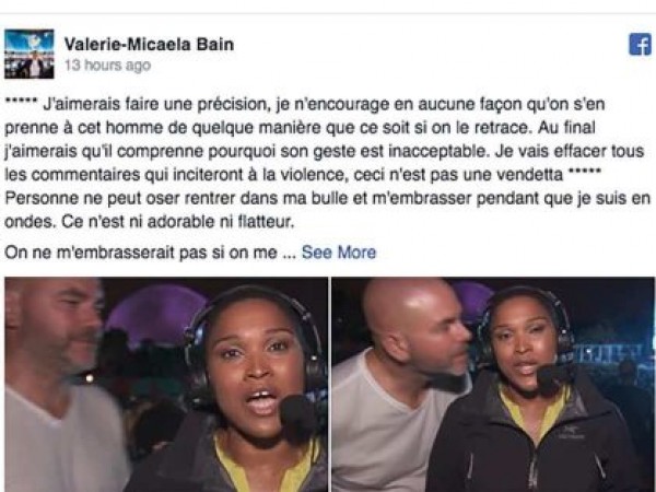 وقد عبرت الصحافية التي تعمل في إذاعة “راديو كندا ” عن استيائها مباشرة بعد القبلة التي اعتبرتها اعتداء عليها، ودفعت المعتدي بقوة قائلة :”لا”، ثم استأنفت عملها.