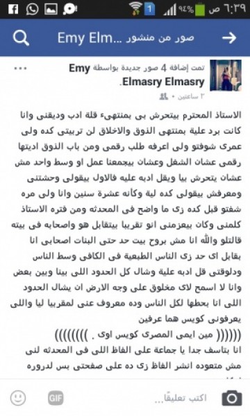 كتبت الفنانة الشابة إيمي المصري على حسابها على "فايسبوك" أنها تعرضت للتحرش اللفظي، ومحاولة استدراجها للحضور لشقة وائل عبد العزيز شقيق النجمة المصرية ياسمين عبد العزيز.
