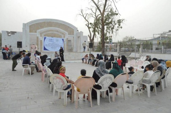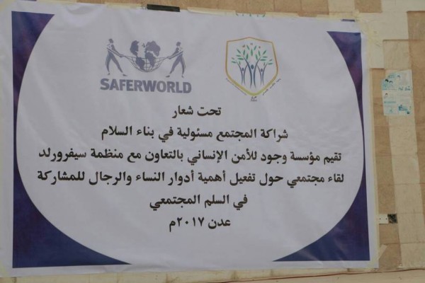 أقامت مؤسسة وجود للأمن الإنساني WHS بالشراكة مع منظمة سيفر ورلد Safer World لقاء مجتمعي مفتوح في باحة نادي شمسان الرياضي الثقافي في مديرية المعلا، تحت شعار(شراكة المجتمع مسئولية في بناء السلام)، حول أهمية تفعيل مشاركة النساء والرجال في السلم المجتمعي، ضمن مشروع(تعزيز دور المرأة في بناء الأمن والسلام).