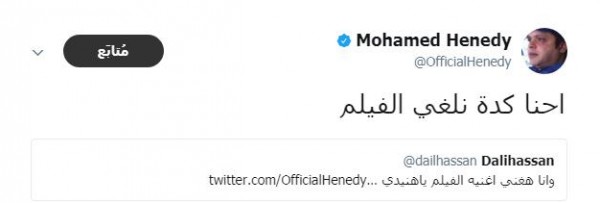 وقالت «دالي»، في تغريدة لها عبر موقع التواصل الاجتماعي «تويتر»: «أنا هغني أغنية الفيلم يا هنيدي»، ورد عليها هنيدي قائلًا: «إحنا هنلغي الفيلم».