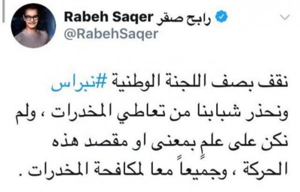 وقال: "نقف بصف اللجنة الوطنية "نبراس" ونحذر شبابنا من تعاطي المخدرات، ولم نكن على علمٍ بمعنى أو مقصد هذه الحركة ، وجميعاً معا لمكافحة المخدرات".