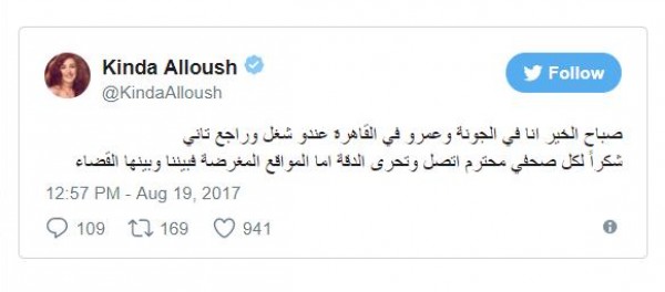 وتابعت:"شكراً لكل صحفي محترم اتصل وتحرى الدقة اما المواقع المغرضة فبيننا وبينها القضاء".