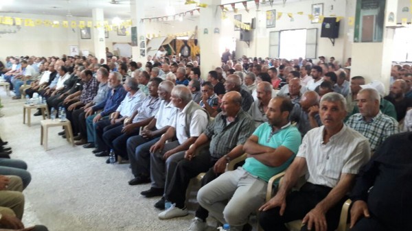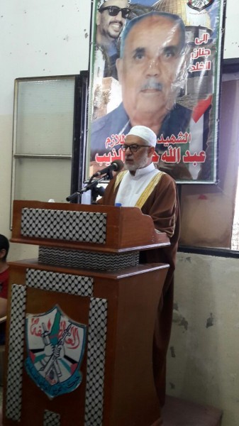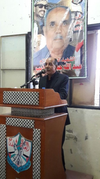 وقال: "اننا في حركة فتح لا نبكي شهدائنا او مناضلونا لاننا نعتبرهم عرسانا نزفهم الى امتنا فهم من يحفروا التاريخ بالتضحية والوفاء، اليوم في هذا الحفل هو موقف لمناضل وتجديد للبيعة وتعزيز الايمان والالتزام للوطن والامة".