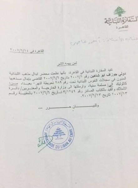 المستند تم توثيقه في السفارة اللبنانية ويفيد بان الفنانة دوللي شاهين كانت مسيحية كاثوليكية ولكنها تحولت إلى الإسلام السني، والسبب في ذلك حتى تحصل على الطلاق من زوجها رجل الأعمال اللبناني سامي سليم المسيحي الماروني.