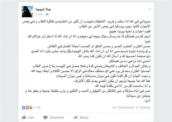 وطلبت "حلا"، من متابعيها عدم السماح للشيطان بالتدخل بينهم وألا يحولوا صفحتها إلى ساحة نقاش تتعلق برفض أو قبول فكرة النقاب، قائلة: "حبيباتي في الله أنا دخلت وقرأت التعليقات فوجدت أن كثيرا من المعارضين لفكرة النقاب وفي بعض الأخوات كانوا مجرد بيسألوا في بعض الأمور عن النقاب.. لقيت أخوات وإخوة بيردوا عليهم".