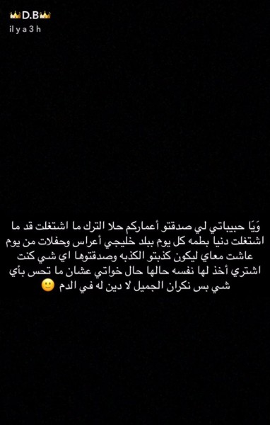 أما عن اتهامها بسرقة ملابس حلا، قالت: "ويا حبيباتي اللي صدقتو عمركم حلا الترك ما اشتغلت قد ما اشتغلت دنيا بطمة كل يوم ببلد خليجي أعراس وحفلات ..من يوم عاشت معاي ليكون كذبتو الكذبة وصدقوتها أي شيء كنت اشتريه أخد لها نفسه حالها حال خواتي عشان ما تحس بأي شيء بس نكران الجميل لا دين له في الدم".