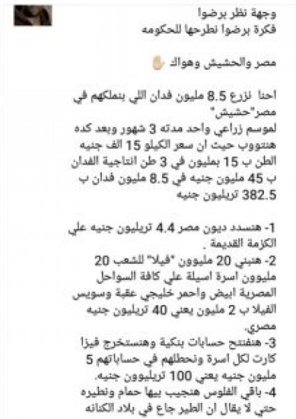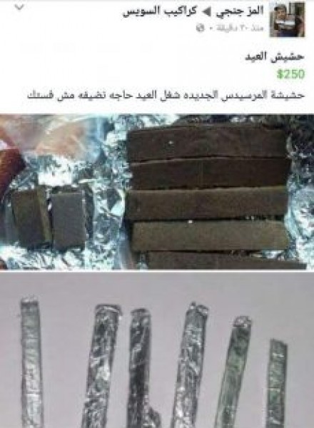 نشر مجهولون إعلانًا لبيع "الحشيش" في مصر عبر موقع التواصل الاجتماعي “فيسبوك” مع تضمين الإعلان خدمة توصيله إلى مكان المشتري بمناسبة عيد الأضحى الذي يشهد إقبالاً على هذا النوع من المواد المخدرة.