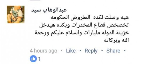 واستكمل المتابعون تعليقاتهم الساخرة بقول أحدهم إن "عرضًا جيد ًا يهدف للترفيه عن الشعب المصري والتسهيل عليه حتى لا يرهق نفسه في البحث عن مروجي الحشيش"، فيما علقت إحدى المتابعات بصورة ساخرة مكتوب عليها: "هيا بنا نحشش"، وطالب أحد المتابعين ساخرًا بأن تخصص الحكومة قطاع المخدرات لزيادة إيرادات الدولة.