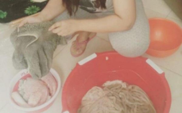 وظهرت سحر وهي تقوم بتنظيف لحم وقصاصين وكرش العجل أو الخروف المذبوح، وهي تضحك.
