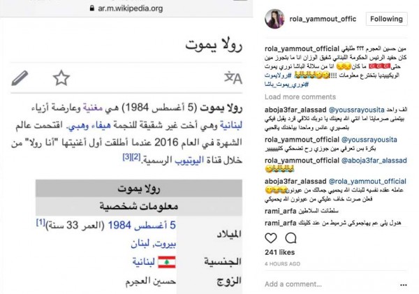 عرضت الفنانة اللبنانية رولا يموت البطاقة التعريفية لها على موقع ويكيبيديا حيث ذكر ان زوجها هو "حسين عجرم".