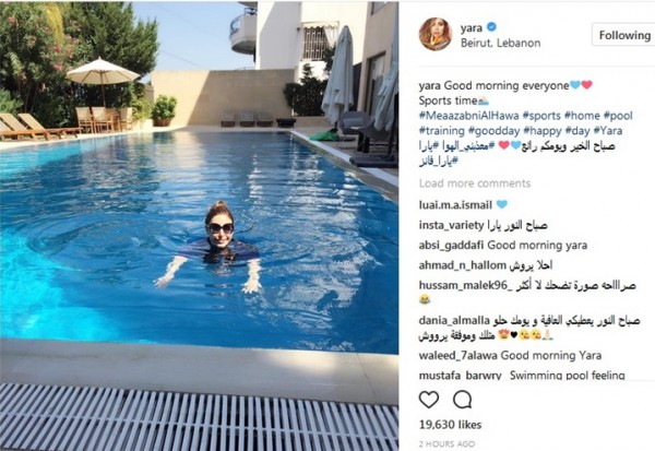 نشرت النجمة اللبنانية يارا صورة جديدة، اليوم الخميس، عبر حسابها على موقع الصور والفيديوهات الشهير "إنستجرام" من حمام السباحة في منزلها ببيروت، وعبرت عن استمتاعها بوقت الرياضة الخاص بها.