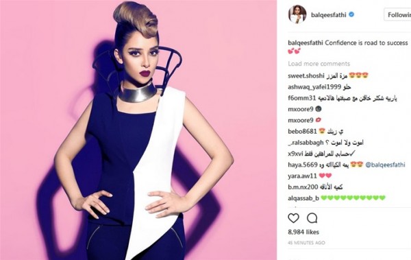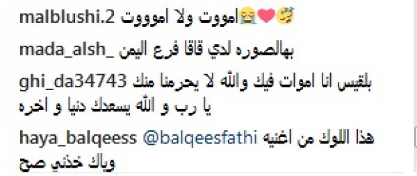 بلقيس علقت على الصورة قائلة "الثقة هي طريق النجاح"، وأشاد بعض متابعيها بجمالها ورشاقتها، بينما سخر آخرون من إطلالتها وشبههوها بالمطربة العالمية صاحبة الإطلالات المجنونة والغريبة "ليدى جاجا"، وقالت التعليقات: "لا بلقيس حركات ليدي جاجا ما نبي"، و"ليدى جاجا فرع اليمن"، ورابطة سلة ملابس في رقبتك"، و"عش حمام فوق رأسك".