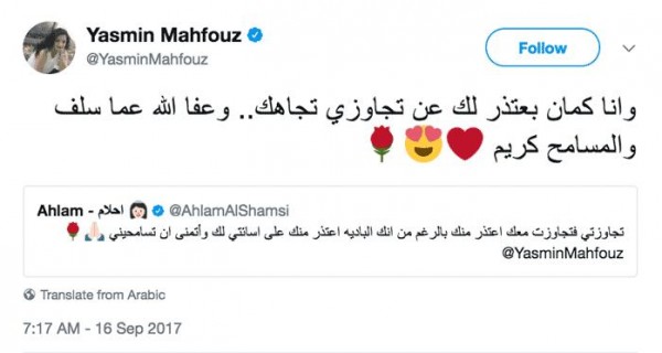 غير ان احلام عادت واعتذرت من ياسمين وطلبت منها السماح قائلة:"تجاوزتي فتجاوزت معك اعتذر منك بالرغم من انك الباديه اعتذر منك على اسائتي لك وأتمنى ان تسامحيني".