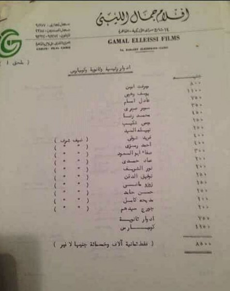 وكان أعلى أجر للفنان الراحل يوسف وهبي وهو 1100 جنيه، وجاء بعده الفنانة ميرفت أمين بمبلغ 800 جنيه، وعادل إمام 750 جنيها، كما جاء اسم نور الشريف ضمن المستند بمبلغ 100 جنيه، لكنه لم يشارك في الفيلم وتم استبداله بالفنان محمد عوض.