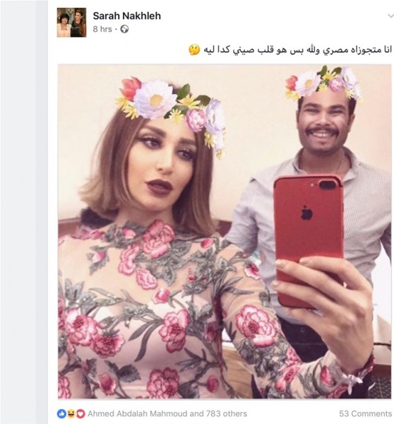 وعلقت "سارة"، على الصورة عبر صفحتها الشخصية على موقع التواصل الاجتماعي "فيس بوك"، قائلة :"انا متجوزاه مصري والله بس هو قلب صيني كده ليه"، وبخاصة أنه ظهر في هذه الصورة بشارب وذقن، وهو ما تطلبه منه دوره في مسلسل "الكبريت الأحمر"؛ حيث يؤدي خلاله دور بلطجي.