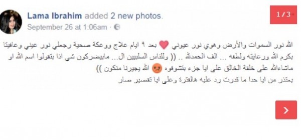 وقالت عبر صفحتها الرسمية على موقع "فيسبوك": "الله نور السموات والأرض وهوي نور عيوني".