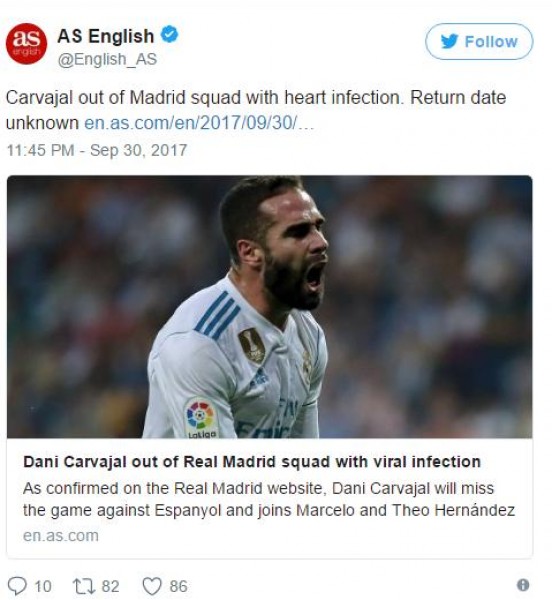 وذكرت صحيفة "آس" الإسبانية، أن الفريق الملكي سيفقد اللاعب الإسباني الدولي داني كارفاخال، الظهير الأيمن، بسبب وعكته الصحية، بحسب "روسيا اليوم".