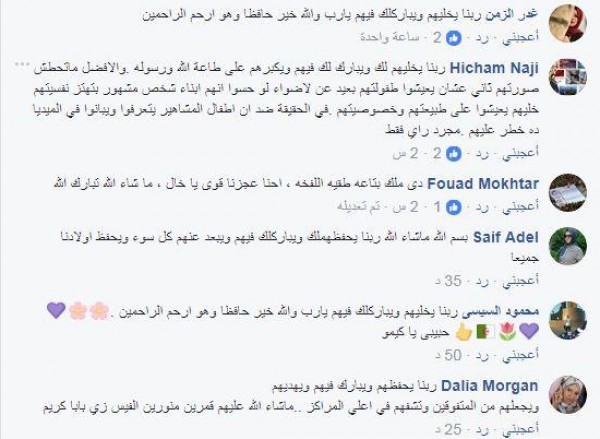 وفي السياق ذاته، علّق أحد متابعي كريم عبد العزيز، ناصحًا:" ربنا يخليهم لك ويبارك لك فيهم ويكبرهم على طاعة الله ورسوله، والأفضل ماتحطش صورتهم تاني عشان يعيشوا طفولتهم بعيد عن الأضواء لو حسوا إنهم أبناء شخص مشهور بتهتز نفسيتهم، خليهم يعيشوا على طبيعتهم وخصوصيتهم، في الحقيقة ضد إن أطفال المشاهير يتعرفوا ويبانوا في الميديا ده خطر عليهم.. مجرد رأي فقط".