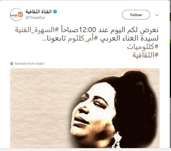 ونشر الحساب الرسمي للقناة الثقافية على موقع التواصل الاجتماعي "تويتر"، تغريدة كتب فيها "نعرض لكم اليوم عند 12:00صباحاً السهرة_الفنية لسيدة الغناء العربي أم كلثوم تابعونا..."، مرفق بهاشتاغ كلثوميات.