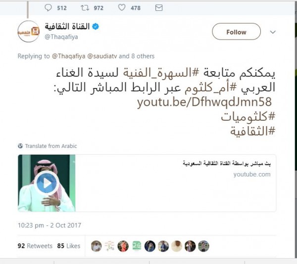 وفي تغريدة أخرى نشرت الثقافية السعودية، رابطا مباشرا وكتبت "يمكنكم متابعة #السهرة_الفنية لسيدة الغناء العربي#أم_كلثوم عبر الرابط المباشر التالي".