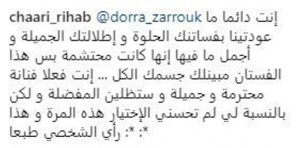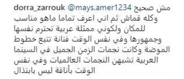 الغريب أن درة اختارت تعليق إحدى المتابعات لها عبر حسابها الرسمي على إنستغرام، وأوضحت لها أن الفستان ليس شفافاً، وهو مبطن من الداخل، وأكدت في تعليقها أن الفستان ليس شفافاً، وهو مصمم من القماش، ومبطَّن. وأضافت في تعليقها أنها تعرف جيداً ماذا ترتدي في المناسبات، لكونها فنانة عربية تحترم نفسها، وفي الوقت نفسه تتبع خطوط الموضة دون ابتذال.