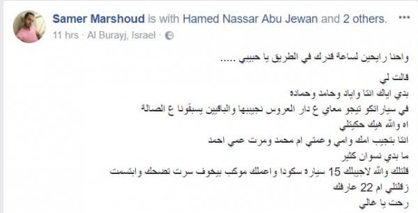 وقام كذلك بنشر صوره أثناء حفل إشهاره، حيث كان آخر اجتماع للعائلة قبل اجتماعهم لعزائه، وعلق:" اخوي حبيبي يوم ما كانت عيلتك معك ف اشهارك والسعادة غمرانا اليوم كل غزة وبرا غزة معك وبتدعيلك وانتا قوي شد حيلك ي سندي ي عمودي فش بعدك فرح ي سعادة الدار وكل من عرفك حبك ي طيب ربي يرجعك ب السلامة لأنه كل غزة ح تفرحلك ي روح اخوك".