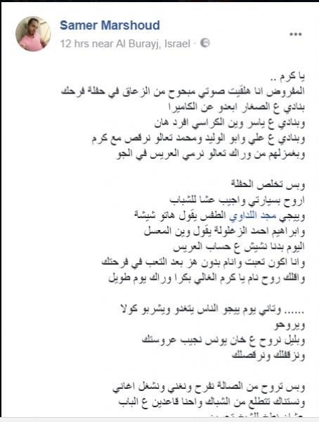 أما نجل عمه (سامر) يتضح من منشوراته أنه الأقرب لكرم، وبدأ بسرد آخر تفاصيل رحلته القصيرة في الدنيا: "واحنا رايحين لساعة قدرك في الطريق يا حبيبي ...قلت لي بدي اياك انتا واياد وحامد وحمادة في سياراتكو تيجو معاي ع دار العروس نجيبها والباقيين يسبقونا ع الصالة اه والله هيك حكيتلي انتا بتجيب امك وامي وعمتي ام محمد ومرت عمي احمد ما بدي نسوان كثير