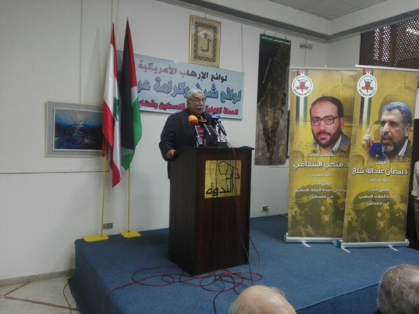 السيد احسان عطايا (مسؤول حركة الجهاد الاسلامي في لبنان) شكر الحضور والقيمين على هذا اللقاء التضامني وقال ليس غريبا على الولايات المتحدة ان تضع اسماء المقاومين على لوائح الارهاب وليس غريبا على المحتلين الصهاينة ان يسعوا الى استجرار الدعم لهم وان يضعوا على قوائم الاغتيالات رموز المقاومة وقادتها، ولم نستغرب من مكتب التحقيق الامريكي اف بي اي وضع الامين العام لحركة الجهاد الاسلامي في فلسطين الدكتور رمضان عبد الله شلح على لائحة الارهاب.