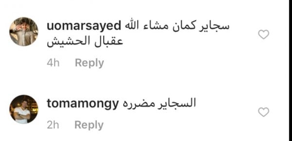 وبمجرد نشر "ريم" الصورة، انهالت عليها التعليقات الغاضبة، والتي كان من بينها: "ليه بتشربي سجاير مش فاهم.. بقيتي شبه المدمنين.. سجائر وفودكا الله يهديكي".