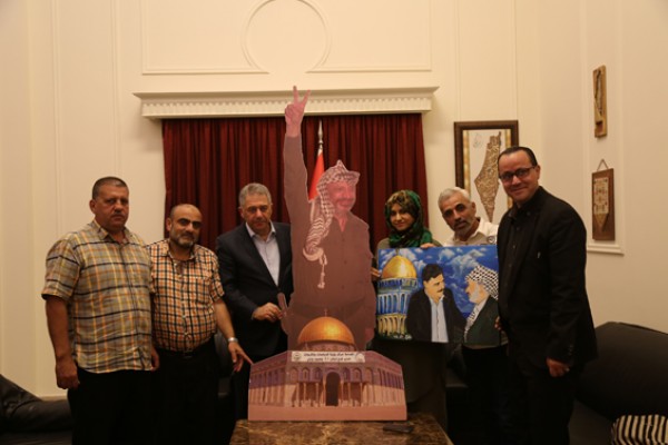 قدم الوفد للسفير دبور لوحة تجسد شخصية الشهيد الرمز الرئيس ياسر عرفات في ذكرى استشهاده الثالثة عشر، تعبيراً عن الشكر والتقدير لما تقوم به سفارة فلسطين في لبنان من تحمل مسؤولياتها اتجاه ابناء شعبنا الفلسطيني في لبنان.