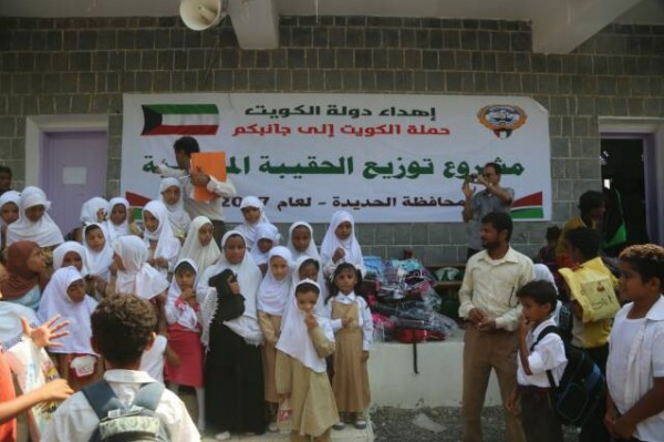 دشنت حملة الكويت الى جانبكم اليوم الثلاثاء مشروع توزيع 20 ألف حقيبة مدرسية في محافظة الحديدة والذي يهدف الى مساندة الشعب اليمني والفئات الاشد فقرا، والمتضررين من الحرب، وذلك ضمن مشاريعها الاغاثية في عموم محافظات الجمهورية اليمنية.