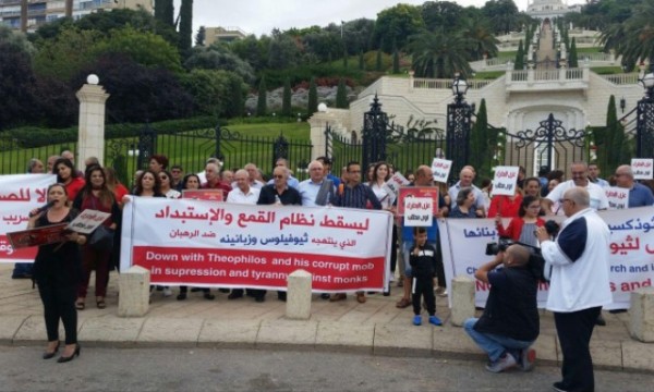 ووقف المتظاهرون عند دوار البهائيين في حيفا، ورفعوا شعارات تطالب بعزل البطرك ثيوفيلوس، و"يسقط نظام القمع والاستبداد الذي يتبعه ثيوفيلوس وزبانيته".