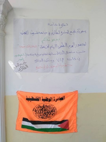 نظم تجمع المبادرة الطلابي الاطار الطلابي لحركة المبادرة الوطنية في جامعة فلسطين الاهلية يوم طبي مجاني وبالتعاون مع مؤسسة الاغاثة الطبية الفلسطينية وعيادات النخبة لطب الاسنان وأطباء مختصون في مجالات مختلفة ومتنوعة تحت عنوان "صحتك بتهمنا" وذلك بمناسبة مئة عام على وعد بلفور وبحضور منسق المكتب الطلابي لحركة المبادرة الوطنية بالمحافظة الرفيق محمد بشير وعدد كبير من رفاق وقادة تجمع المبادرة الطلابي وطلاب الجامعة حيث تم من خلال النشاط استهداف اكثر من 250 طالب وطالبة وذلك في قاعة الكافيتريا الرئيسية بالجامعة.