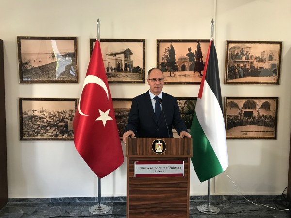 عقد سفير دولة فلسطين لدى الجمهورية التركيه د. فائد مصطفى مؤتمرا صحفيا هذا اليوم في مقر السفارة في العاصمة أنقره وبحضور عدد كبير من الاعلاميين ووسائل الاعلام ومحطات التلفزه التركيه وتركز الحديث خلاله على جريمة العصر المتمثله في وعد بلفور والتي أعطى بموجبها من لا يملك لمن ليس حق .