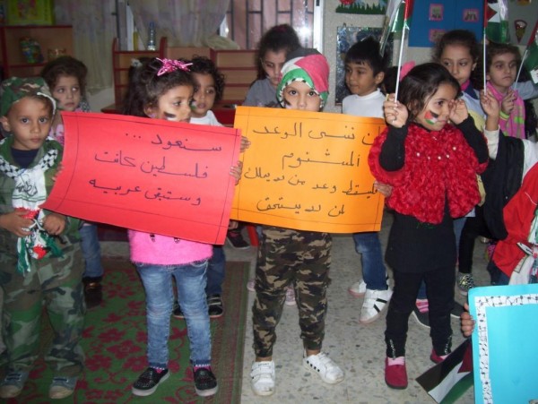 أحيـت روضة الشهيدة هـدى شعلان الـذكـرى المئويه لوعد بلفورالمشؤوم في مقرها بعين الحلوة يوم الخميس 2/11/2017 ، وزينت خلالـه جباه الأطفال بالأعلام الفلسطينية ، وبتوجية المربيات قاموا بتلوين رسوم رمزية من البيانات الورقة المخصصة للتنشأة الوطنية ومنها ( علم فلسطين ، خارطة فلسطين ، المسجد الاقصى، قبة الصخرة ، مفتاح العودة ورسم بياني بعنوان سنعود ياجدي ، سنعود ياأمي).