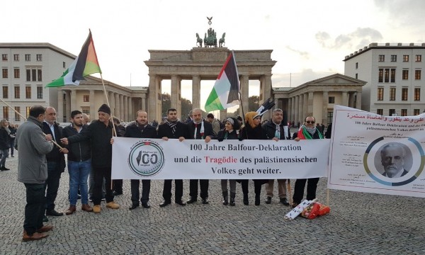 نظمت لجنة العمل الوطني الفلسطيني في برلين بتاريخ 02.11.2017 وقفة غضب وإحتجاج بمناسبة الذكرى المئوية لوعد بلفور المشؤوم وذلك أمام بوابة برلين التاريخية وسفارة المملكة المتحدة في العاصمة الألمانية برلين.