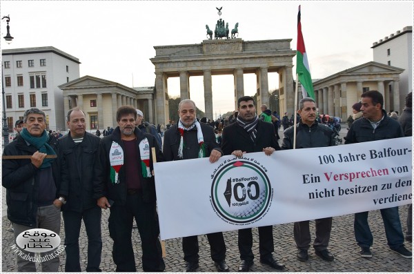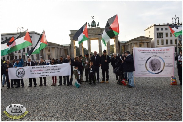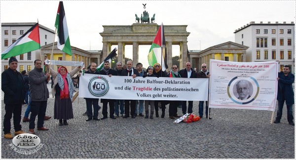 حيث نظمت لجنة العمل الوطني الفلسطيني وبالتعاون مع سفارة فلسطين في برلين يوم الخميس الثاني من تشرين الثاني/ نوفمبر وقفة احتجاج امام مقر السفارة البريطانية وسط العاصمة الالمانية برلين.