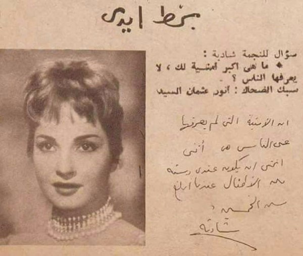 نُشر صورة لأمنية كتبت بخط يد الفنانة المصرية شادية، ونشرت في إحدى المجلات الفنية في فقرة خاصة تحمل اسم «بخط يدي».
