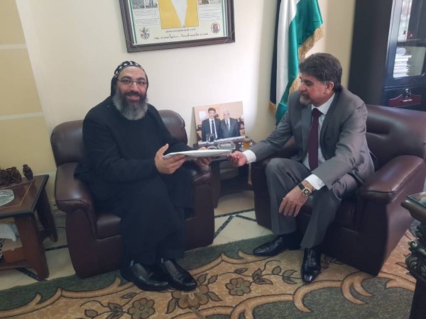 باسم سيادة الرئيس عباس. معبراًعن اعتزاز الكنيسة السريانية بمواقف الرئيس عباس القومية والحكيمة في دعم التآخي المسيحي الإسلامي ليس فقط في فلسطين وإنما في العالم .