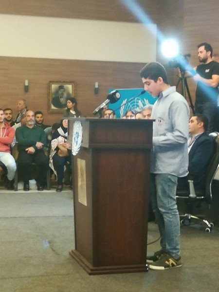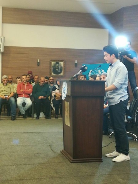 وكانت كلمة مؤثرة بالمناسبة للطالبتين الفلسطينيتين نور موعد من مدرسة نابلس باللغة العربية وشغف قادرية من مدرسة بيسان باللغة الانكليزية ، حيث عرضتا معاناة الشعب الفلسطينية منذ وعد بلفور الى اليوم والقرارات الدولية التي تكفل حقوق الشعب الفلسطيني والتي لم تنفذ حتى الأن ، مؤكدين على تمسك هذا الشعب بكامل حقوقه وفي مقدمتها حق العودة .