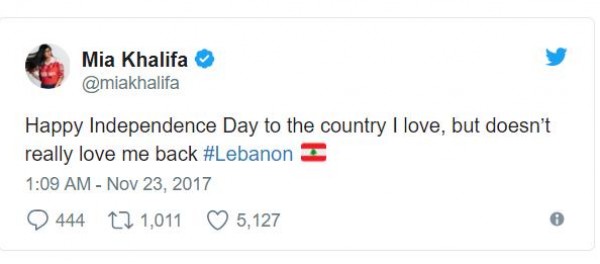 غرّدت ممثلة الأفلام الإباحية السابقة اللبنانية الأصل ميا خليفة على حسابها الشخصي على تويتر في مناسبة عيد الاستقلال في لبنان.