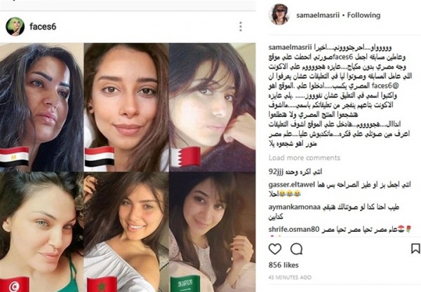 "سما" نشرت صورتها مع الفنانات المنافسات لها، وعلقت قائلة: "أحرجتوني.. أخيرًا صورتي اتحطت على موقع faces 6، وعاملين مسابقه أجمل وجه مصري بدون مكياج، عايزة هجوم على الأكونت اللي عامل المسابقة، وصوتوا ليا في التعليقات، عشان يعرفوا إن المصري يكسب، ادخلوا على الموقع واكتبوا اسمي في التعليق عشان نفوز، عايزة الأكاونت بتاعهم ينفجر من تعليقاتكم باسمي، أما أشوف هتشجعوا المنتج المصري، ولا هتطلعوا أندال، هجوم، هدخل على الموقع أشوف التعليقات، وأعرف مين صوتلي على فكره متكدبوش عليا، علم مصر منور أهو، شجعوه يلا".