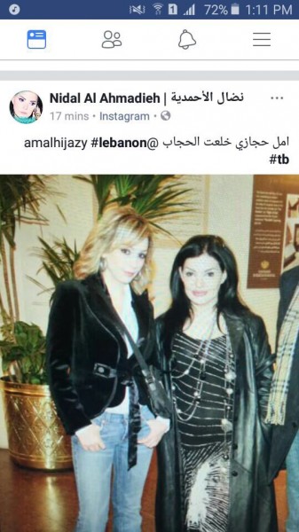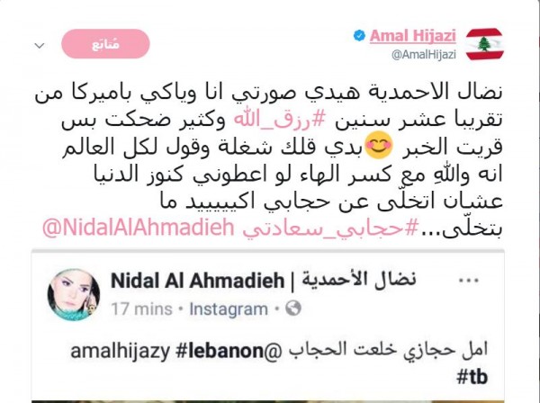 وعلّقت عليها قائلة: "نضال الاحمدية هيدي صورتي انا وياكي بأميركا من تقريبا عشر سنين وكثير ضحكت بس قريت الخبر بدي قلك شغلة وقول لكل العالم انه واللهِ مع كسر الهاء لو اعطوني كنوز الدنيا عشان اتخلّى عن حجابي اكيييييد ما بتخلّى… حجابي سعادتي" .
