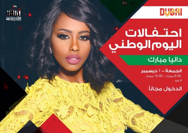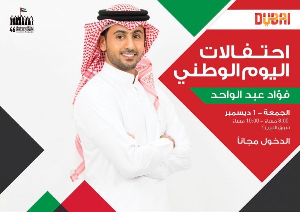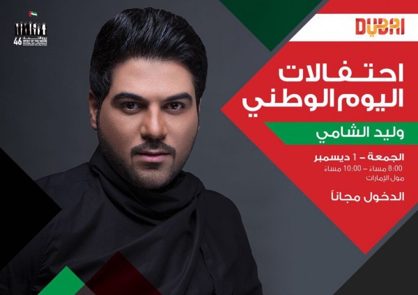 إحتفالاً باليوم الوطني لدولة الإمارات العربية المتحدة، تنظم هيئة السياحة في دبي، ثلاث حفلات غنائية جماهرية، يحييها الفنانين وليد الشامي وفؤاد عبد الواحد وداليا مبارك، في ثلاث أماكن مختلفة، وذلك يوم الجمعة الموافق 1 ديسمبر 2017، الساعة الثامنة مساء من تعهد وتنظيم فني لراشد السعيد.